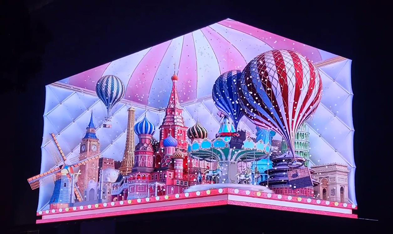 该裸眼3D大屏位于无锡市中山路上,是无锡商业区对外展示的窗口项目。屏幕总面积近1038㎡,实现了5G+8K前沿科技的组合。其中屏体宽61.44米,高16.896米,整个屏幕由1700万颗LED灯珠构成,横向分辨率达到7680超高清标准,采用90°无缝转角模组技术和高对比吸光面罩技术,实现多路信号无缝切换,具备户外高等级的防水、抗风、高清、广视角等功能。
